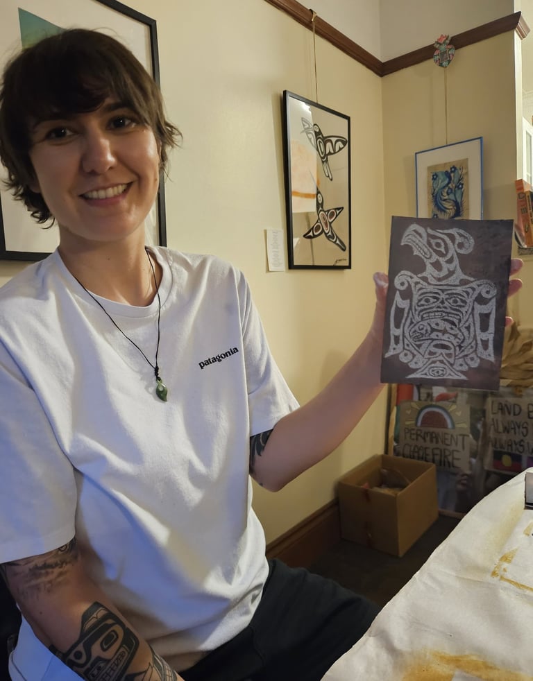 Moe Patrick-Barr is a Na̱mg̱is (Kwakwa̱ka̱'wakw) artist from the Pacific Northwest. Currently based in Meanjin, Australia. They are inspired by learning their traditional language (Kwakwala), and incorporating that into their art and their life as a diaspora first nations person.